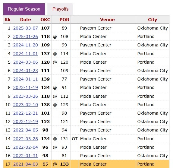 本場比賽過后,開拓者終結了自己面對雷霆的16連敗,上次他們贏雷霆還是在2021年4月4日。