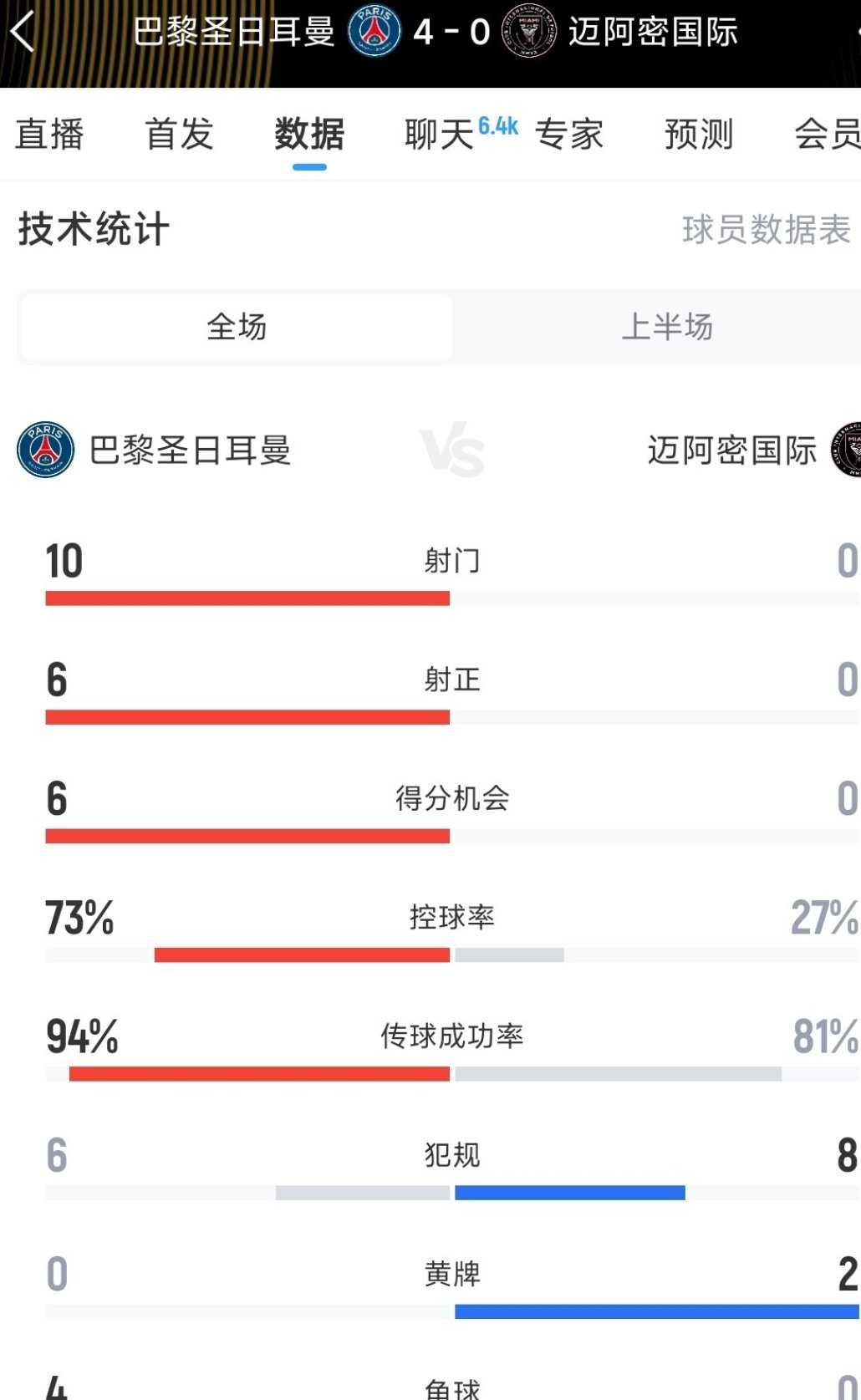 差距太大!巴黎4-0邁阿密半場數據:控球率73%-27%,射門10-0!