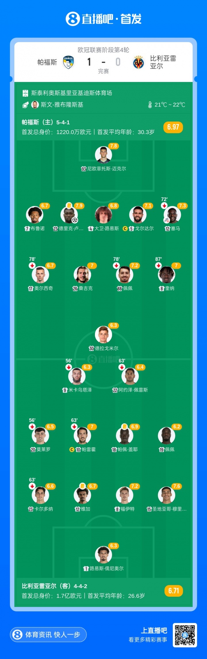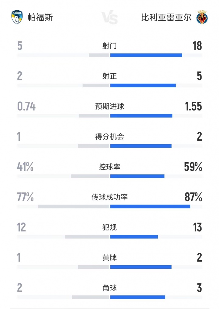 而無奈成為背景板的比利亞雷亞爾本場比賽在數據上占據絕對優勢,幾乎在所有的統計數據上都領先對手,但18腳射門、5次射正全都沒能轉化為進球,反倒被帕福斯利用角球機會破門。