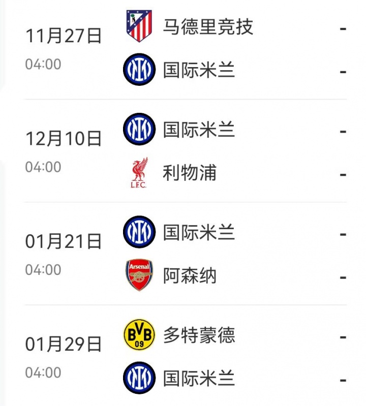 雖然第一階段前四場比賽全勝,但國米接下來的歐冠賽程兇險異常。本階段下半程,國米將先后對陣馬競、利物浦、阿森納和多特,其中對陣馬競(第5輪)和對陣多特(最后一輪)是客場作戰。