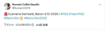該記者表示:“奧斯曼-登貝萊,2025年金球獎得主!”這位記者供職于多家法國正規媒體,有比較高的可靠度。