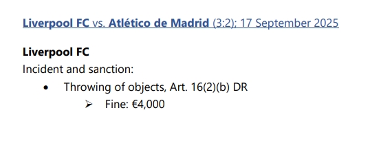 10月01日訊 歐冠首輪比賽,利物浦3-2戰(zhàn)勝馬競。本場比賽中,利物浦因為球迷投擲物品,違反《歐足聯(lián)紀律準則》第16(2)(b)條,俱樂部被罰款4000歐元。
