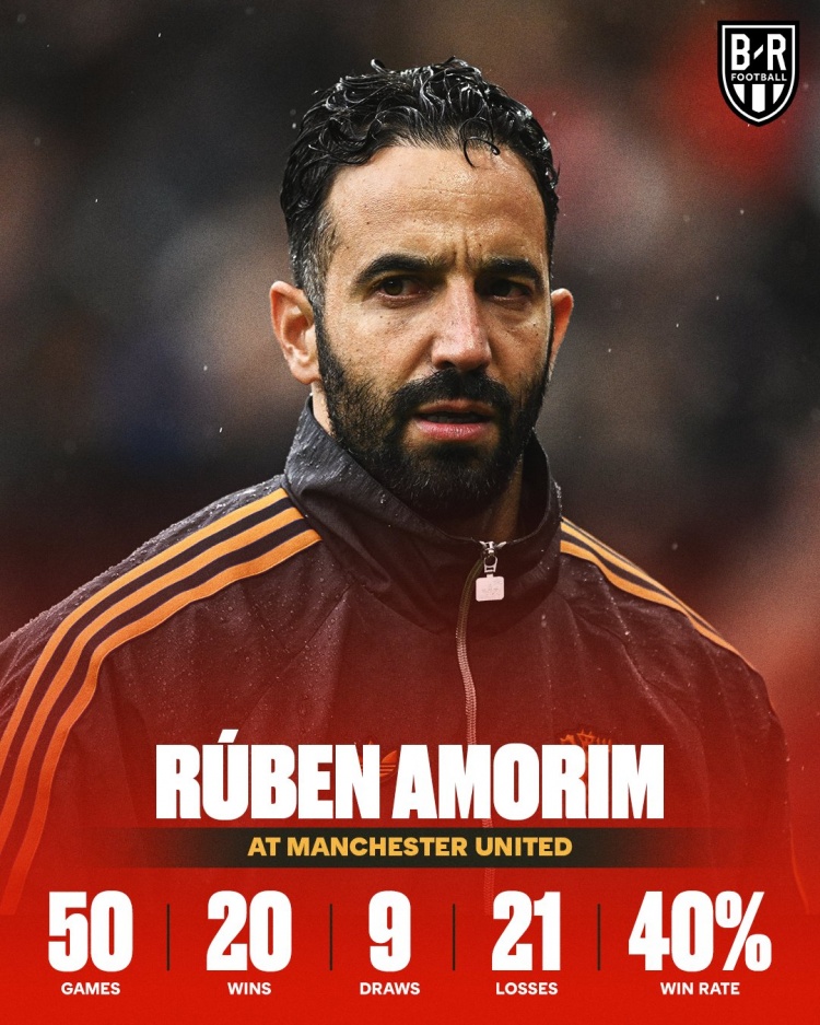 美媒B/R Football曬出海報,海報中羅列出阿莫林執教曼聯以來的戰績:50場比賽,20勝9平21負,勝率40%。