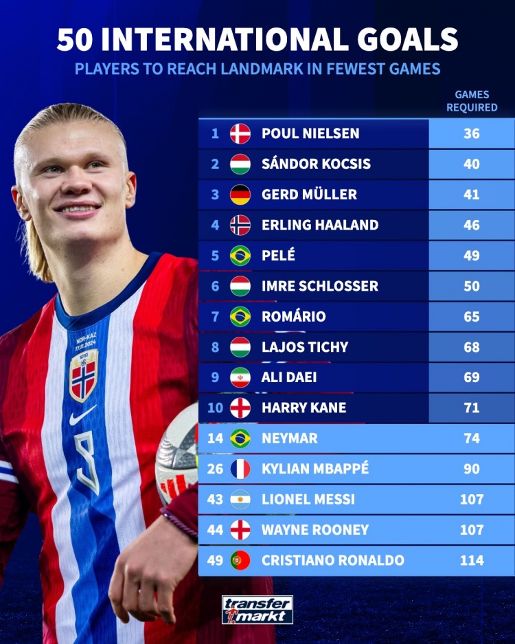 國家隊最快達50球所用場次:哈蘭德46場第4、梅西107場和C羅114場