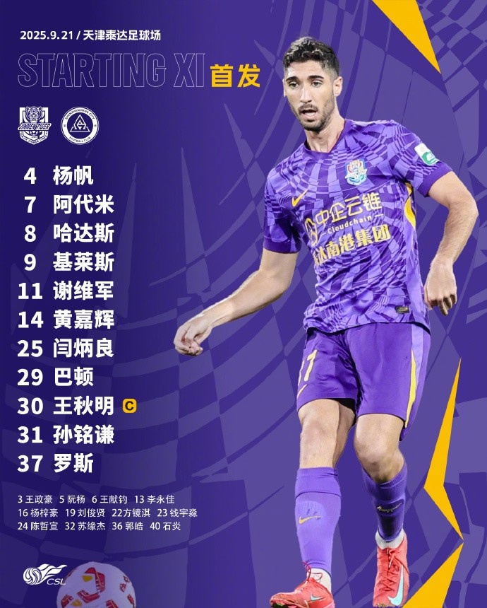 中超第25輪主場對(duì)陣深圳新鵬城,天津津門虎首發(fā)出爐!